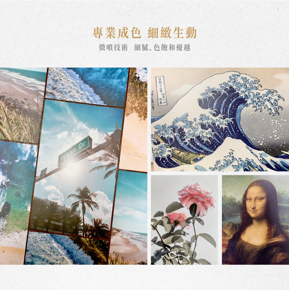 當然搭配我們的木畫框也很棒。邊框特有設計留間隙,使成品呈現3D立體感,對空間氛圍非常加分。